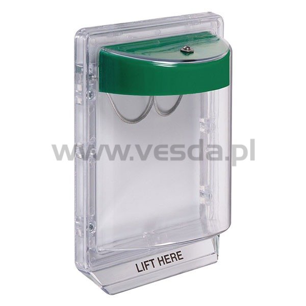Osłona Stopper jest dostarczana w kolorze czerwonym wraz z instrukcją obsługi: W RAZIE POŻARU PODNIEŚ POKRYWĘ I ZBIJ SZYBKĘ.