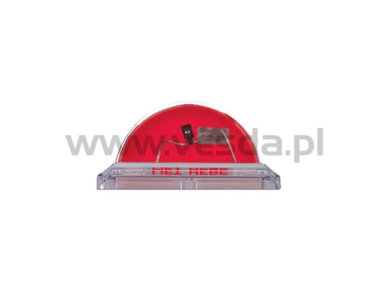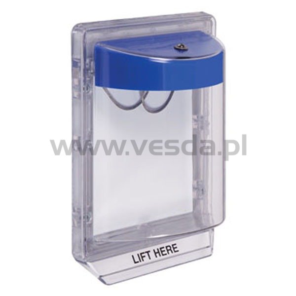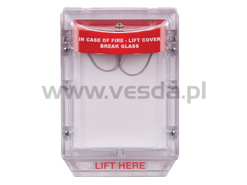 Osłona Stopper jest dostarczana w kolorze czerwonym wraz z instrukcją obsługi: W RAZIE POŻARU PODNIEŚ POKRYWĘ I ZBIJ SZYBKĘ