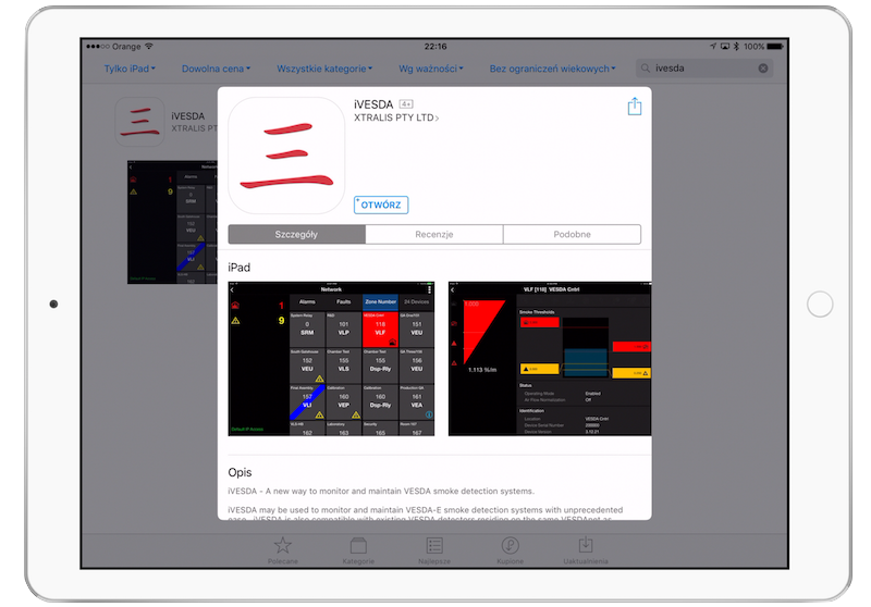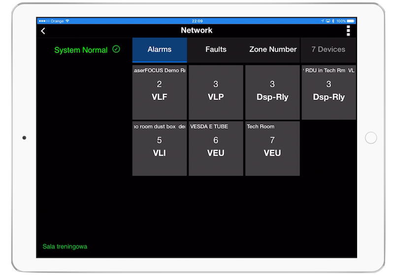 Korzystając z aplikacji iVESDA użytkownicy systemu VESDA otrzymują intuicyjny interfejs jak i wszechstronny sposób monitorowania całej sieci VESDAnet. Przekazywane informacje o statusach urządzeń, alarmach, uszkodzeniach czy konfiguracji można w łatwy sposób odczytać bezpośrednio z urządzenia przenośnego, bez potrzeby korzystania z komputera i interfejsu High Level.