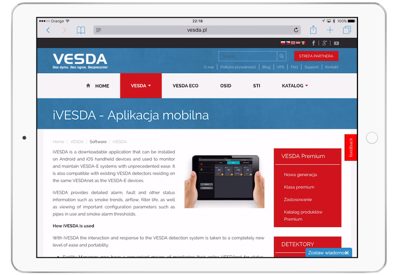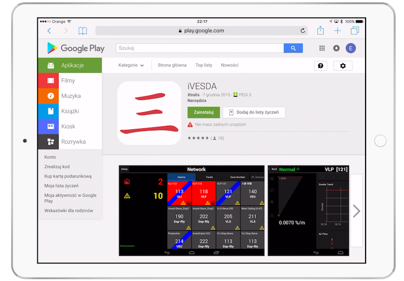 iVESDA to mobilna aplikacja przeznaczona na urządzeniach przenośnych z systemem iOS i Android. Aplikacja umożliwia monitorowanie i przeglądy systemów VESDA-E z niespotykaną łatwością. iVESDA jest również kompatybilna z istniejącymi detektorami VESDA zamontowanymi na tej samej sieci VESDAnet z detektorem VESDA-E jako urządzenie dostępowe.