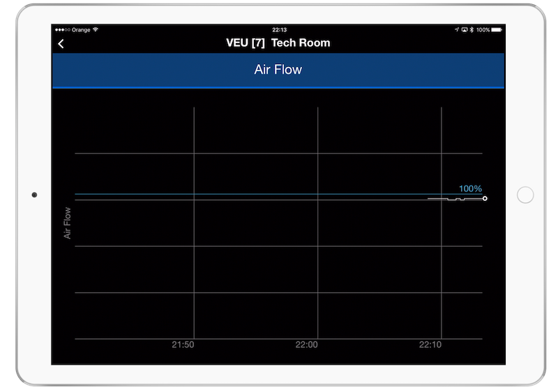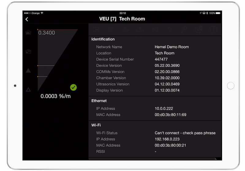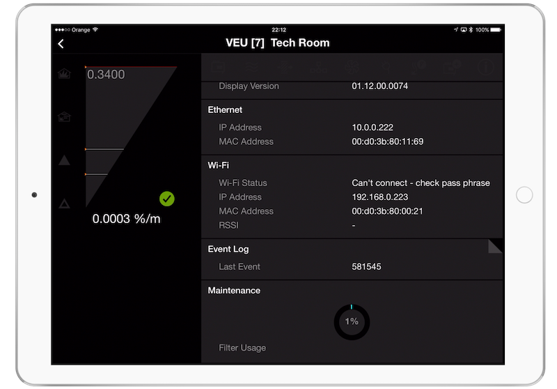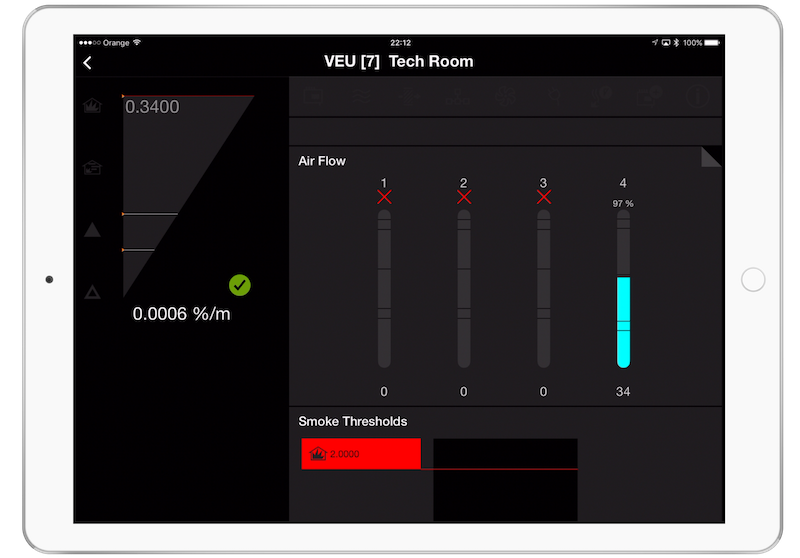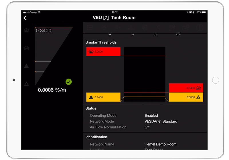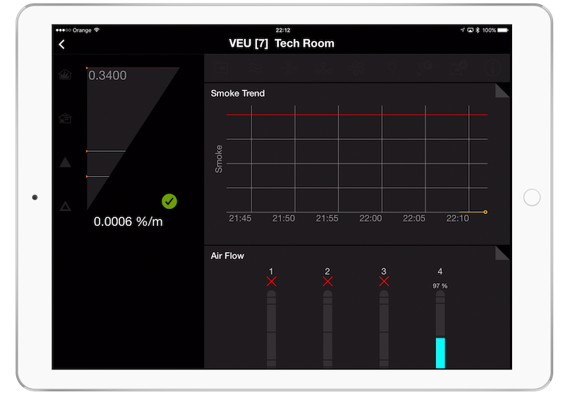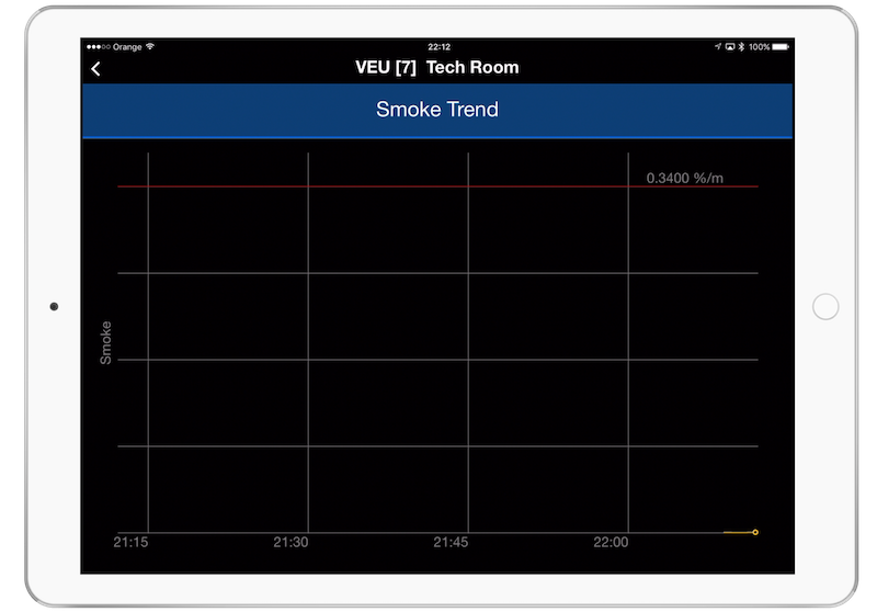 Aplikacja iVESDA dostarcza szczegółowych informacji o poziomie zadymienia, alarmach, uszkodzeniach, trendach dymu, przepływie powietrza, żywotność filtra, a także przeglądanie ważnych parametrów konfiguracyjnych.